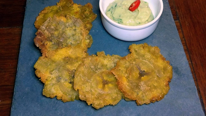 medalhões prensados de banana-da-terra chips, acompanhados de guacamole. Ou
