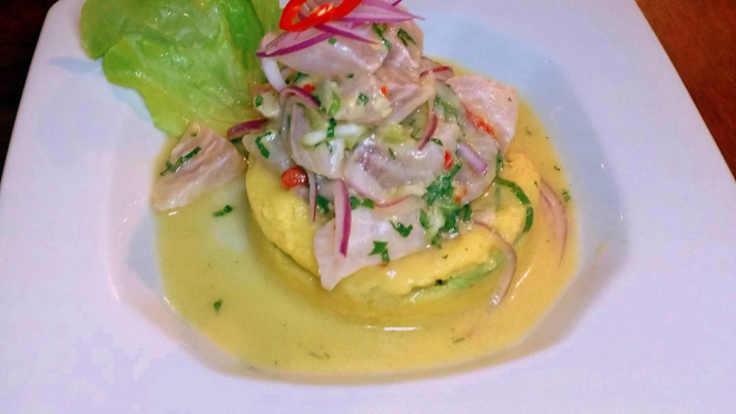 fusão entre dois pratos tradicionais: por baixo, uma causa (aquele purê de batata, quase sempre recheado), e por cima o ceviche. Mas também há outras variações