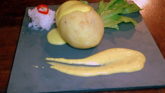 centenas de variações lá no Peru -, o cardápio também oferece Papa rellena (R$ 22, duas unidades), que