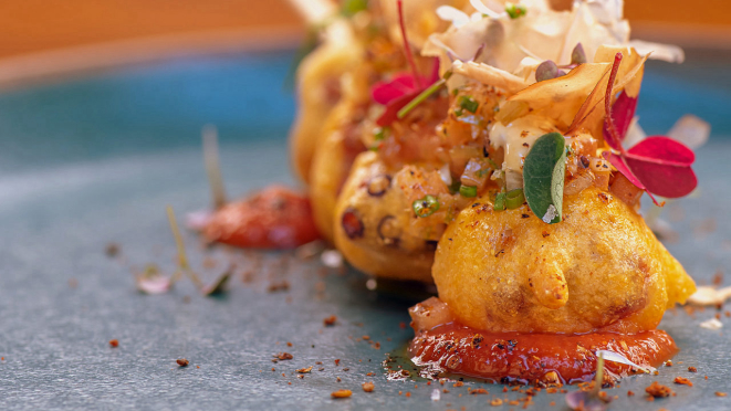 (21), inspirada pelo tradicional cachorro-quente no palito, é o Polvo corn dog, molho taco, tomates verdes