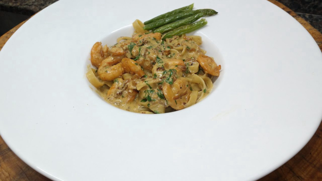 Pensei, então, em propor um ingrediente que mexe com as nossas sensações, atiça as papilas gustativas e sempre cai no gosto de qualquer um: o camarão. Que, descascado e limpo custa em torno de R$ 85 o quilo, lá na Keli Mozer, no Mercado Municipal. Como fiz a receita individual, precisei apenas de 120g e paguei R$ 10,20. Da massa foram apenas 80g, que, num pacote de 500g a R$ 7, custaram R$ 1,12. Mais um tantinho de creme de leite, o curry, a colher de vodca e os outros ingredientes, que, somados, chegaram a R$ 8.