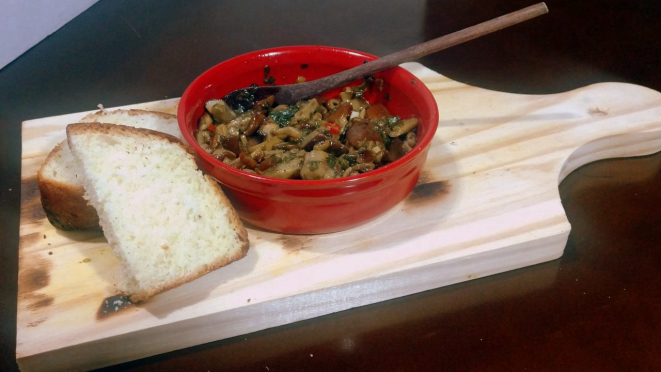 estava pronto. Servi com fatias de pão caseiro.
