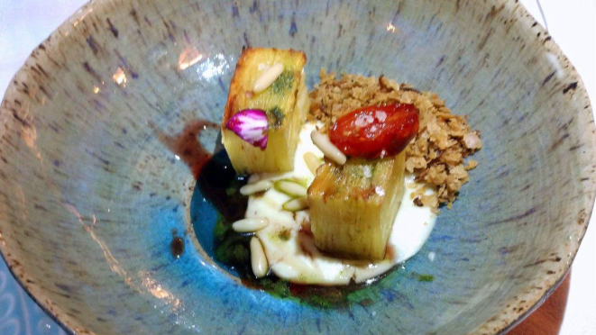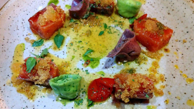 folhas de mandioca, fonduta de pecorino sardo e farofa de cebola crocante, Massas recheadas (tapenade) de bacalhau e verde,
