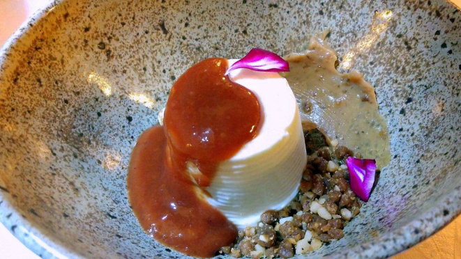 coulis de laranja, quinoa, ovas de tobiko e gravlax de salmão, Pancetta, demi glace vegetal com mirtilo e