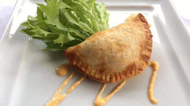 de folhas orgânicas cubos de frango ao curry e molho de ervas e Folhado de bacalhau cremoso.