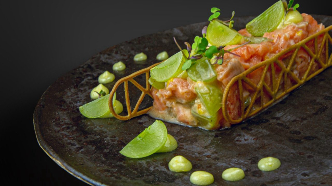 58), uma composição com salmão, creme de limão siciliano, uvas verdes e alguns temperos.