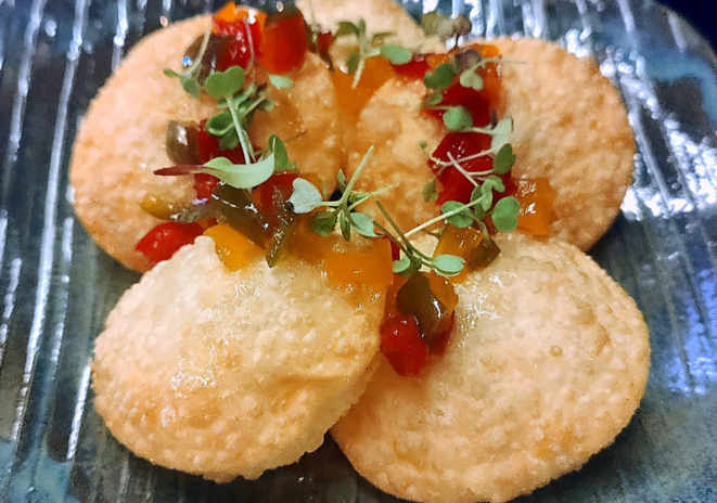 próxima a biscoito. A outra que apreciei foi a de Pastéis de Brie (R$ 32, 5 mini pasteis) com geleia de pimentões, com
