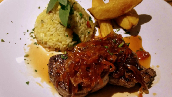 caipira da Nonna com polenta, e um mignon chamado Filetto brasiliano, que é o medalhão grelhado, com cebola