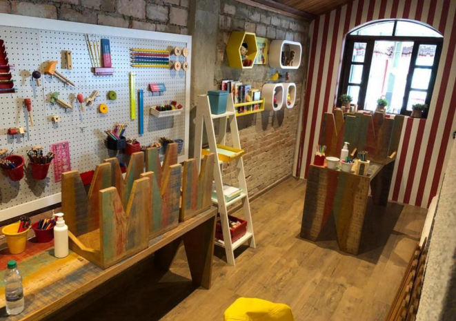 até um espaço para crianças, com lápis de cor de outros itens para entreter os