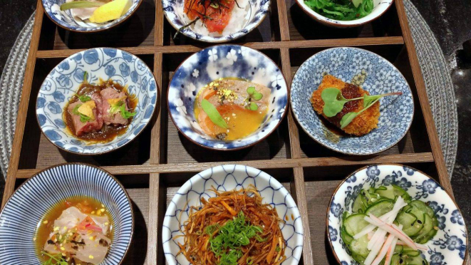 o que veio, nas nove divisões da caixinha encantada? Hirashi wakame (salada de algas), Tartare coreano de atum apimentado, Ussuzukuri de robalo com vinagrete, Sunomono de pepino com kani, Carpaccio