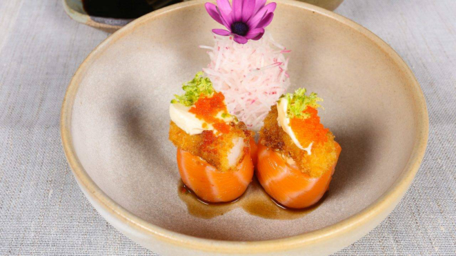 com a crocância dos harumakis (massa do rolinho primavera). Tem ainda o Carpaccio de salmão selado (finas fatias