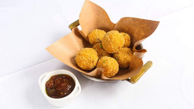 bolinho italiano de risoto, que aqui é apresentado como Arancini di mare, com uma variedade de frutos do mar. A receita