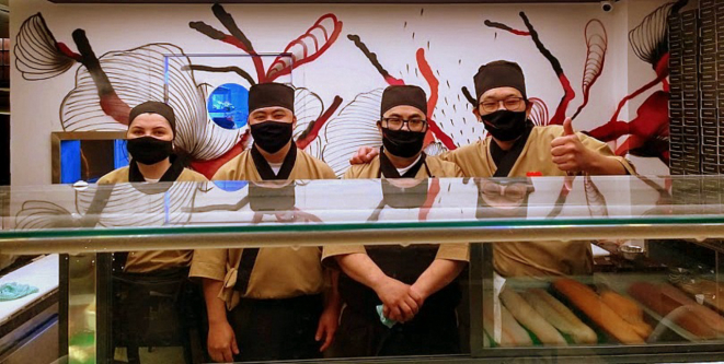 atrás do balcão, que conta ainda com Pedro Noda (chef de sushi) e da auxiliar