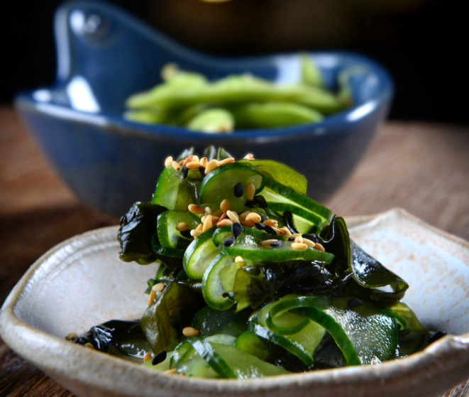 Saquê Jun Daiti, para o brinde inicial. Junto, chegam os primeiros petiscos, o Otoshi, a entrada, a escolher entre o Edamame (a vagem verde de soja) ou o Sunomono (o pepino agridoce).