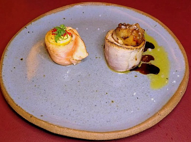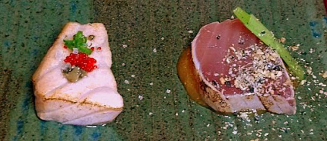 foie gras selado e Salmão com gema de