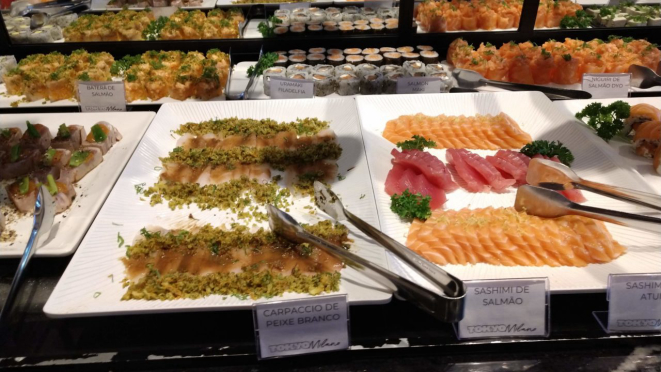 Tinha sashimis de salmão, de atum (sim, blue finn naquele dia, mas não é