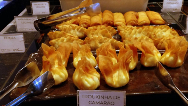 manteiga, Yakissoba, Yakimeshi (Arroz frito com ovos, vagem, cenoura e cebola), Lulas empanadas e Tilápias