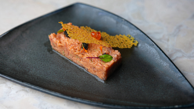 tartare de atum e maionese de abacate, seguido de Purê de cenoura braseada com missô, peixe grelhado, sunomono e picles