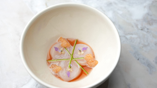 partes anuncia o início, o Amuse-bouche novamente com a Ostra Haiyo (Tokubetsuna kake) e o Tempurá de ostra com texturas de maçã.