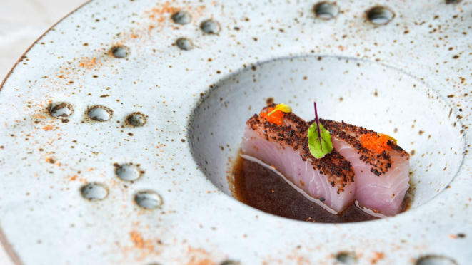 de tobiko, aspargos e velouté de baunilha, seguida de um Cupim curado, com pimenta sansho, molho de shiitake, cogumelo eryngui,