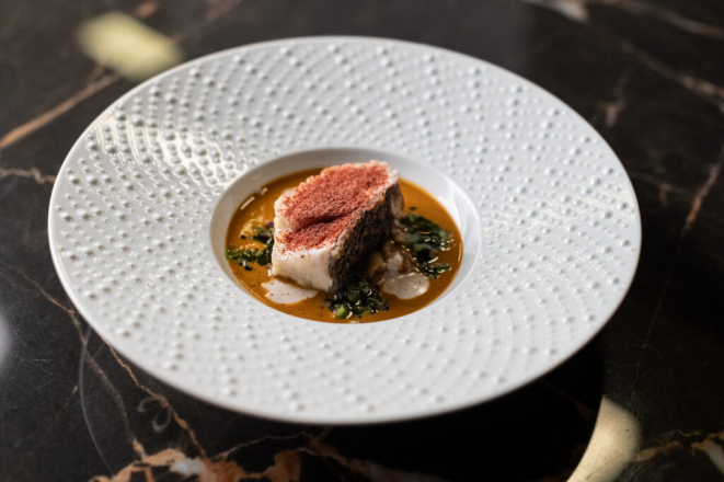 O primeiro dos pratos principais é o Peixe. É apresentando em prato fundo (chapéu), com uma base de salsa de marisco e leva creme de inhame com coco seco, vinagrete de pimenta cambuci com azeite de manjericão e um surpreendente pó de morango fermentado, que cobre o peixe grelhado na churrasqueira. A escolha do peixe sempre depende da melhor oferta do dia no mercado.