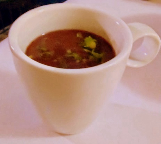 delicioso caldinho de feijão, mais farinha de mandioca, vinagrete, molho de alho