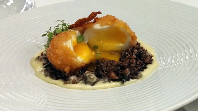 fonduta de queijo parmesão e crispy de presunto cru. O resultado final não