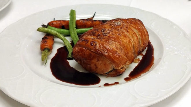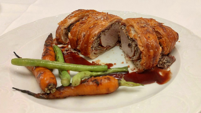 Vieram, então, os pratos principais. Um deles foi o Porc Wellington (R$ 88), que é uma interpretação do chef, com carne suína, para o clássico feito com filé mignon. O filé mignon suíno é envolvido em duxelle (quase uma pasta) de cogumelos, presunto cru e massa folhada e servido acompanhado de legumes salteados (cenouras e vagens, no caso) e jus com toque de cacau chamativo e delicioso.