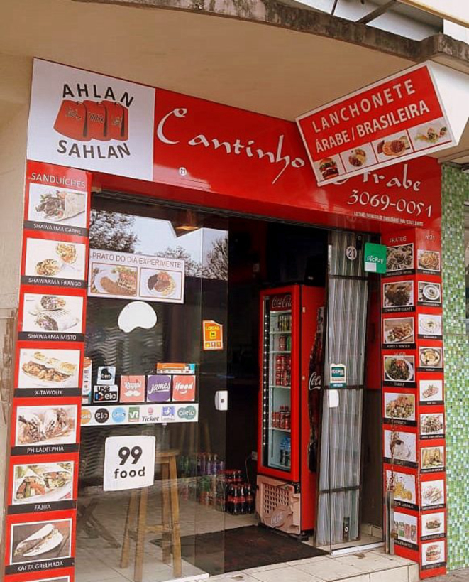 portinha e uma placa: Comida árabe e brasileira. Era quase meio dia, mas não