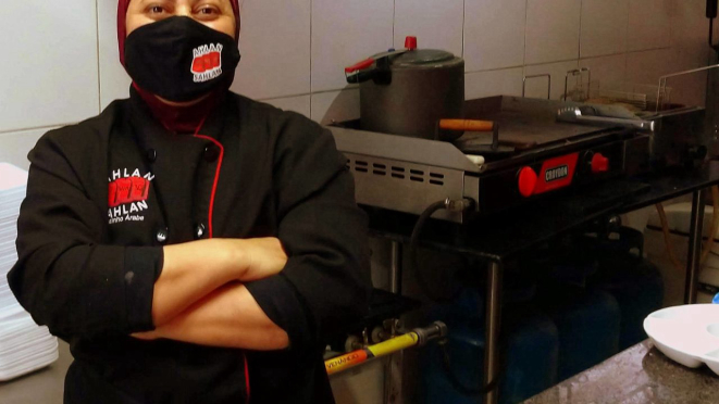 árabe, é “Ahlam Sahlam”, que é justamente o nome de seu pequeno restaurante, quase