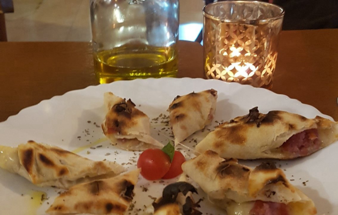 rotollinas – pequenas pizzas enroladinhas recheadas – ou crostinis.