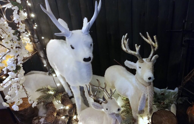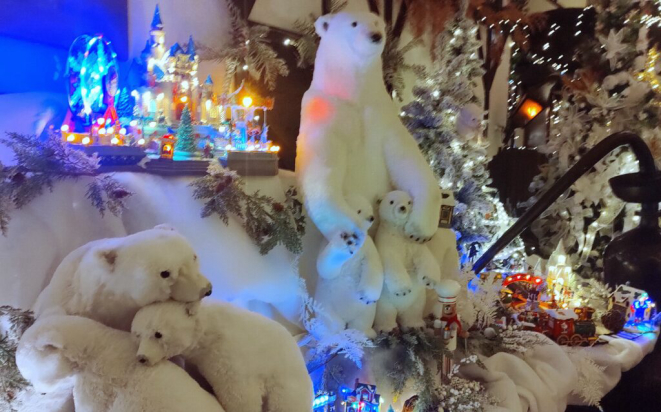 Sendo inverno, o espaço é marcado pelo branco das neves fictícias, com detalhes que remetem ao frio natalino europeu, como renas brancas e ursos polares (que bem parecem os verdadeiros) cuidadosamente posicionados para transmitir a ideia de um ambiente gelado. A paleta inicial privilegia o branco e tons suaves, passando a sensação de um inverno nevado.