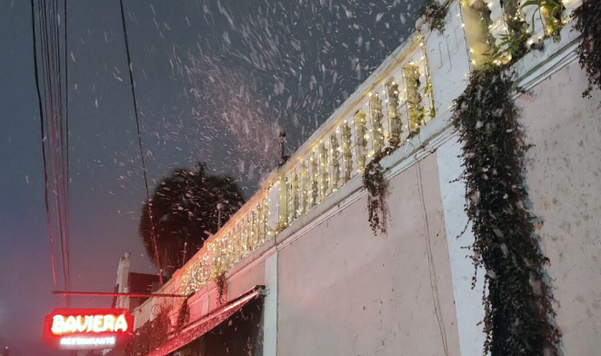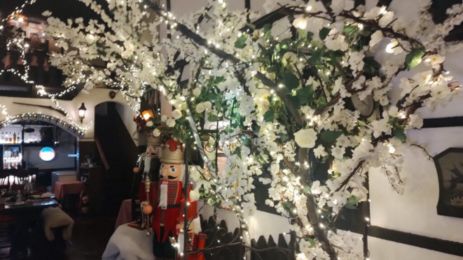 O festival de luzes e de branco na entrada do salão da Cantina Baviera, com a decoração natalina. | Foto: Anacreon de Téos
