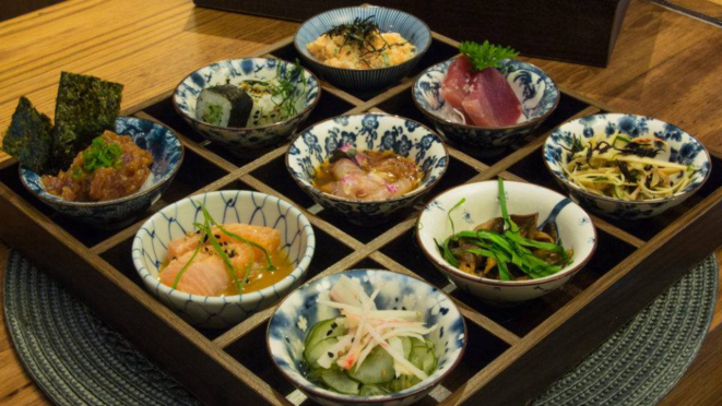 de pepino, ou pela salada de alga marinha, ou ainda pelo tempurá,