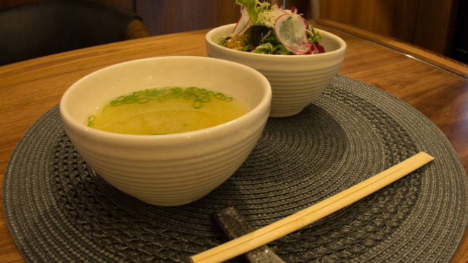 A degustação de nove pratos, quentes ou frios, que aparecem na caixa de madeira seguindo o modelo dos mais tradicionais restaurantes japoneses é para mim, que costumo comer pouco, até demais. Saladinha bem temperada e uma sopa de missô vem antes.