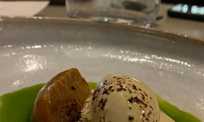 a do ASU: um creme de melão levemente defumado, com sorvete de pistache, noz pecã caramelizada, finalizado com pó de cenoura e azeite de manjericão.