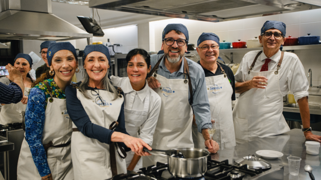 A próxima etapa foi na cozinha. Nem deu tempo de respirar. De avental e touca, estava pronta para cozinhar, mas os homens na bancada foram mais rápidos. Entrei em cena apenas na hora de fazer o molho que Manu Buffara ensinaria.